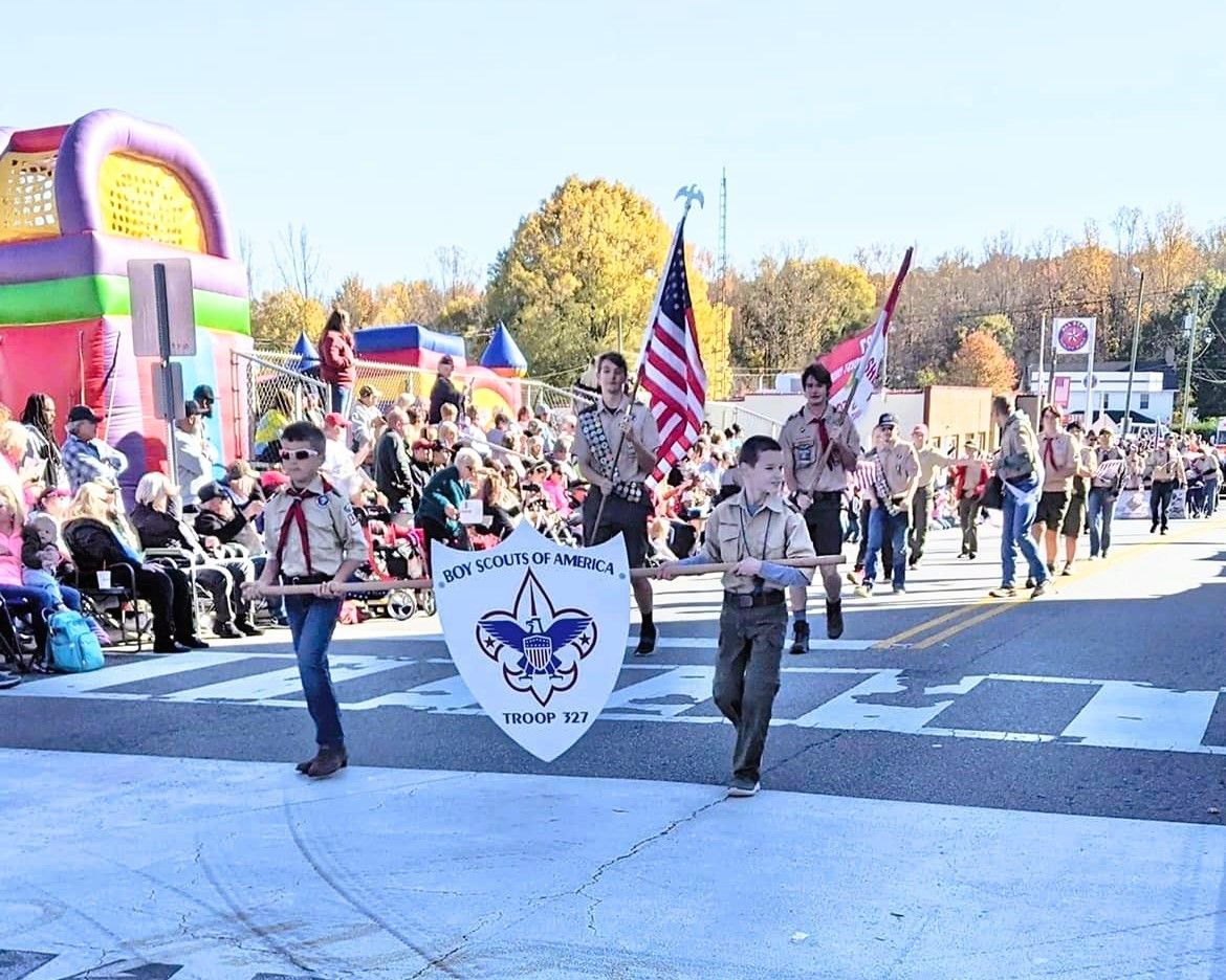 Scouts and Cubs of 327 brought honor to our Veterans and supported our new charter VFW Post 5305 by marching in the Catawba Veterans Day Parade.