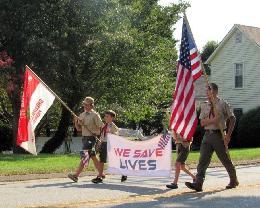 Troop 327 was invited to participate in the America Rolls Strong Truck Parade in Claremont, NC to honor the memory of attacks on September 11, 2001. Multiple trucking companies and rescue groups paraded their patriotically wrapped trucks.