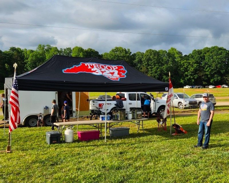 The Scouts of Troop 327 participated in a combination fundraiser / campout at the Foothills Antique Power & Tractor Show held at the American Legion Fairgrounds in Hickory, NC. The scouts camped for the weekend and kept the fairgrounds clean by gathering the trash all weekend. The adults sold drinks and snacks at the store on the midway.